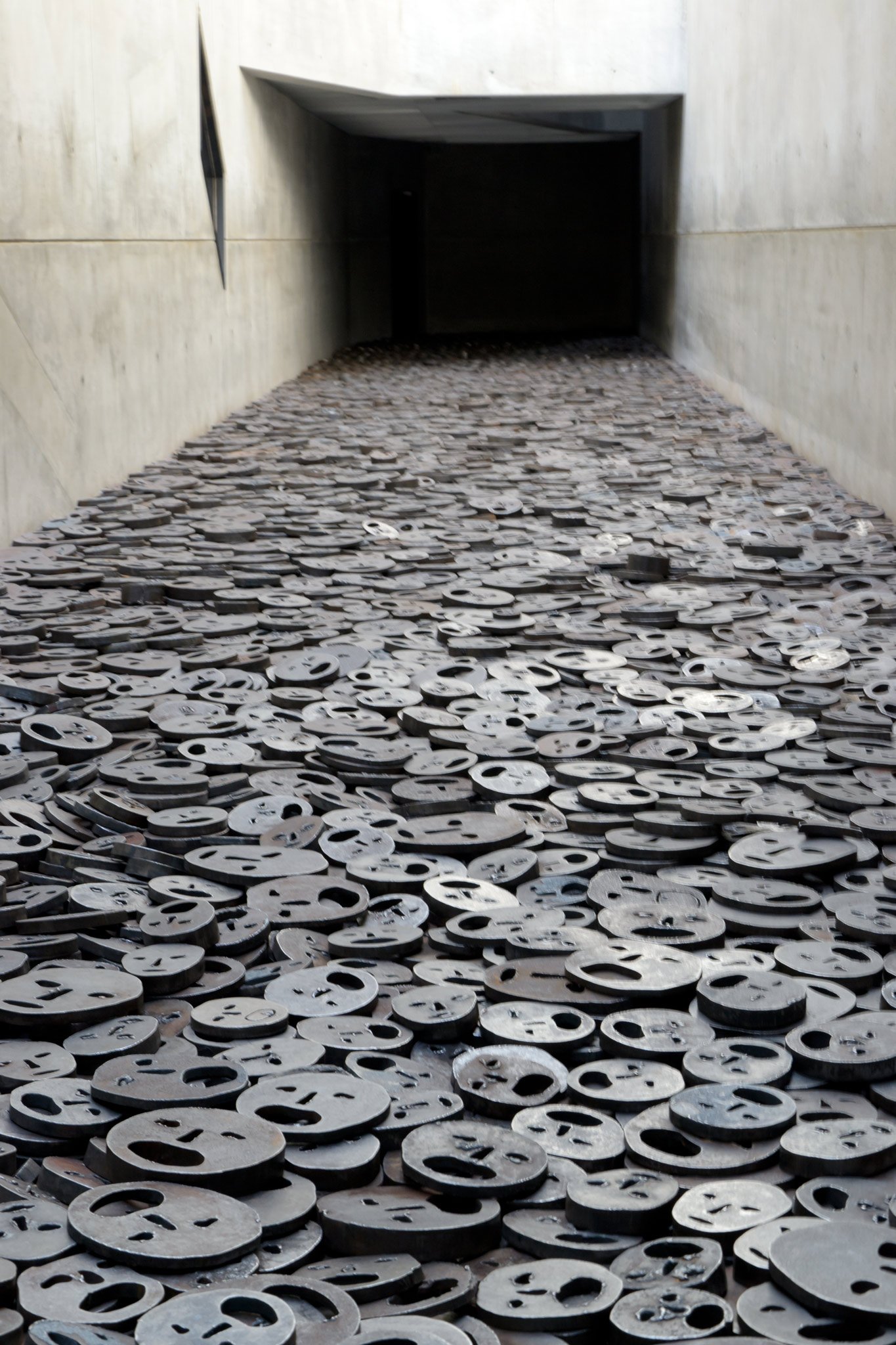 in uno dei “vuoti”, passaggio obbligato, è situata su tutto il pavimento l’installazione “Shalechet” – Foglie cadute – di Menashe Kadishman, dedicata a tutte le vittime di guerre e violenze, costituita da 10.000 dischi in metallo, staccati uno dall’altro, ogni disco porta ritagliati e con le stesse dimensioni dei volti umani, il frastuono impressionante provocato dal calpestio dei visitatori sui dischi di metallo, incrementa la sensazione d’angoscia.
