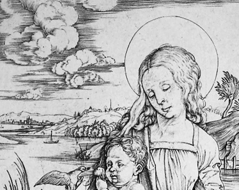Si tratta di un’altra interessante xerigrafia di Albrecht Dürer nella quale ho intravisto un velato legame con “La madonna con la scimmia” da ritenere « la donna vestita di sole » dell’Apocalisse. Naturalmente rimando alla lettura di del saggio ” La Damigella sul cavallo e il Lanzichenecco” che ho scritto, la spiegazione che vi riguarda (ma è ancora inedito), ora vale capire com’è che le due “Madonne” sono la stessa persona. Ma non è difficile prenderne atto con la prova dello specchio, cioè mettendo a confronto le due xerigrafie che vi riguardano.