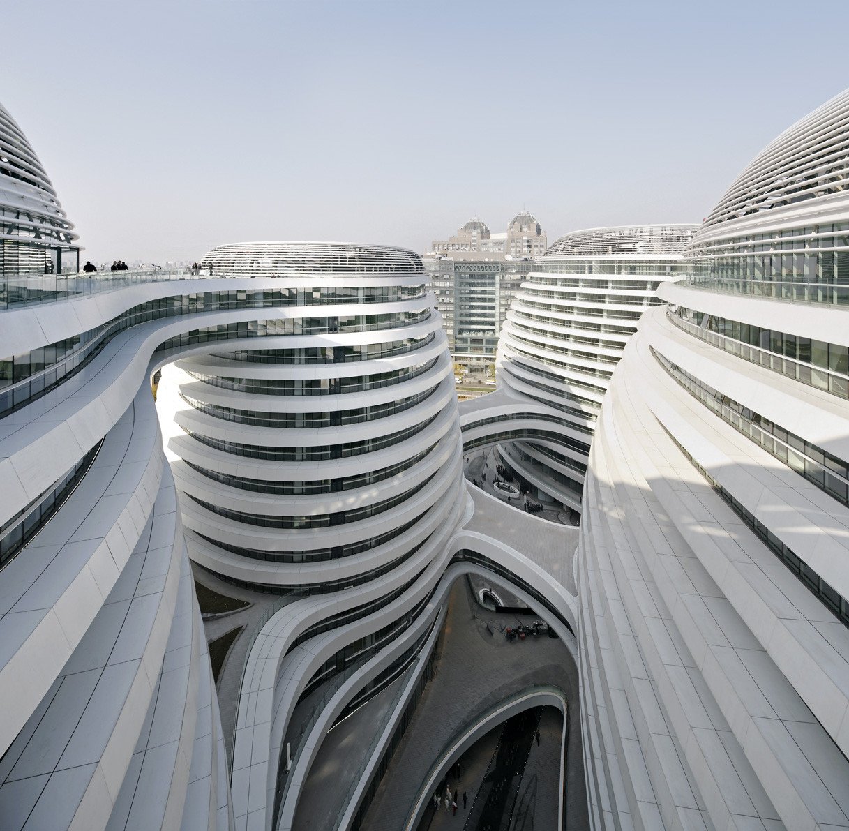 I Wangjing SOHO sono tre grattacieli curvi di altezze differenti, dalla forma fluida. Immaginati da Zaha Hadid come “montagne intrecciate” e vincitori del premio Emporis Skyscraper Award 2014, riescono a suggerire l’immagine di vele spiegate o ventagli cinesi. E proprio come ventagli cinesi i volumi girano uno intorno all’altro intersecandosi e fondendosi in un’unica piattaforma comune. Gli edifici sono diventati un punto di riferimento del contesto cittadino di Pechino, integrandosi e caratterizzando l’ambiente.